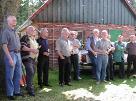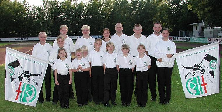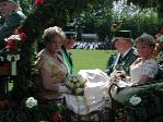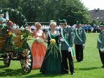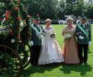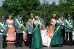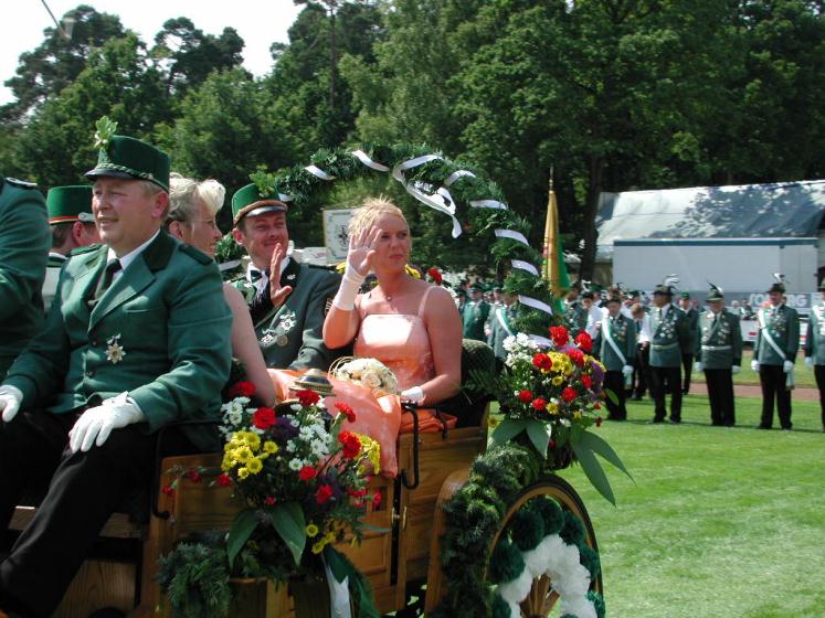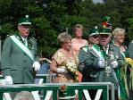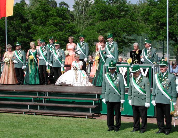 Der Sonntag zeigte sich, wie man es sich für den gesamten Hofstaat wünscht, von seiner besten Seite. Strahlender Sonnenschein am Himmel und auf den Gesichtern aller Beteiligten. Nach dem Antreten in der Allee und Abholung der Fahnen erfolgte der Umzug durch Hövelhofs festlich geschmückten Strassen zu Festplatz.