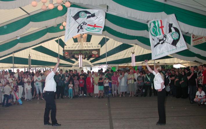 Zu Ehren des Königspaares und des Hofstaats führten die Fahnenschwenker ein tolles Programm mit musikalischer Unterstützung vor. Sie begeistern alle Anwesenden so sehr, das sie am Montag erneut um einen Auftritt gebeten wurden. Diesem Wunsch kamen sie selbstverständlich gern nach und so konnten sich nochmals zahlreiche Besucher an dem Programm der Fahnenschwenkerabt. erfreuen.