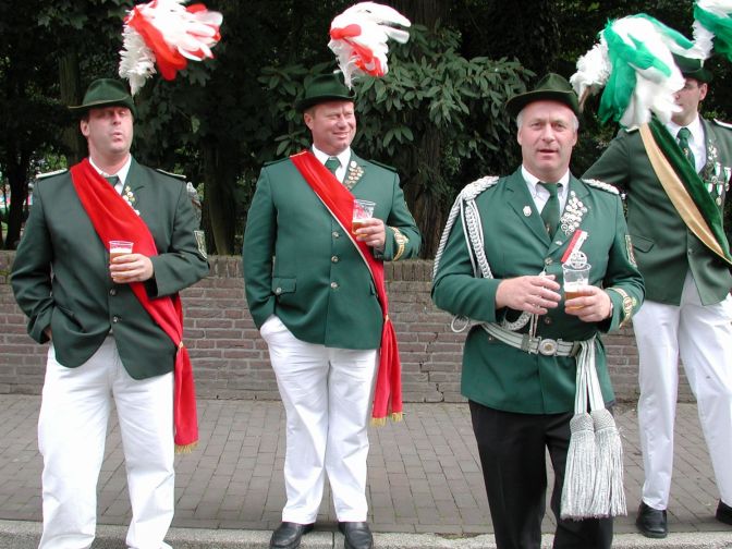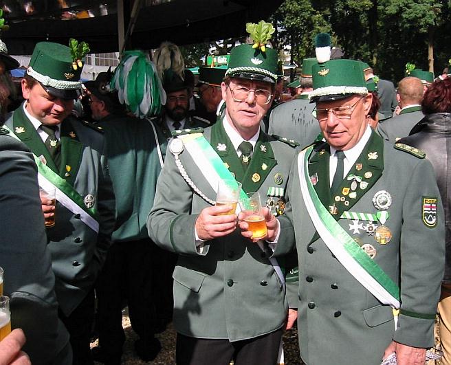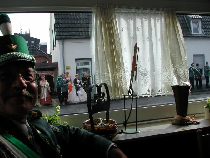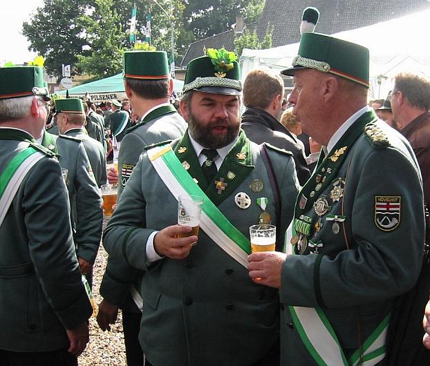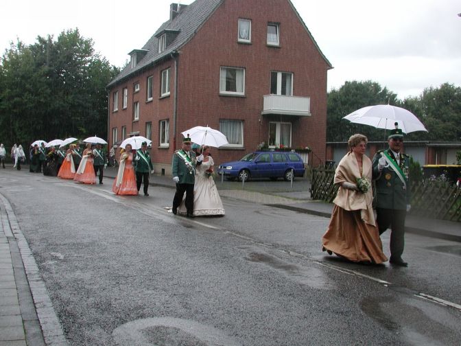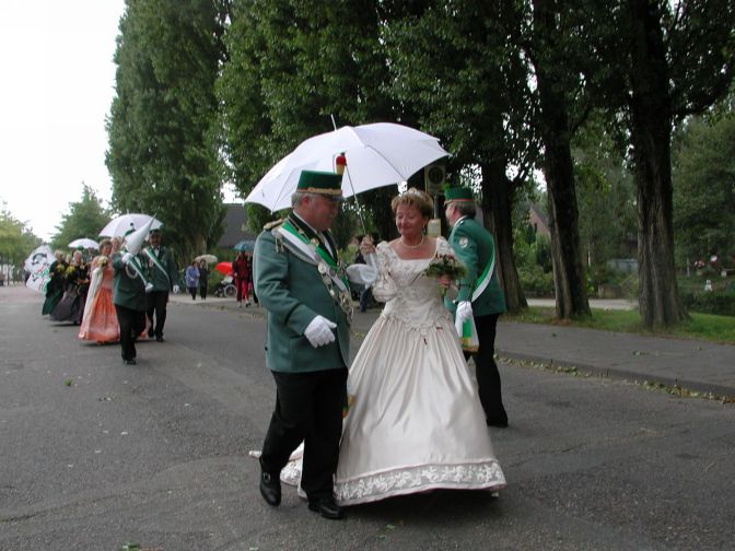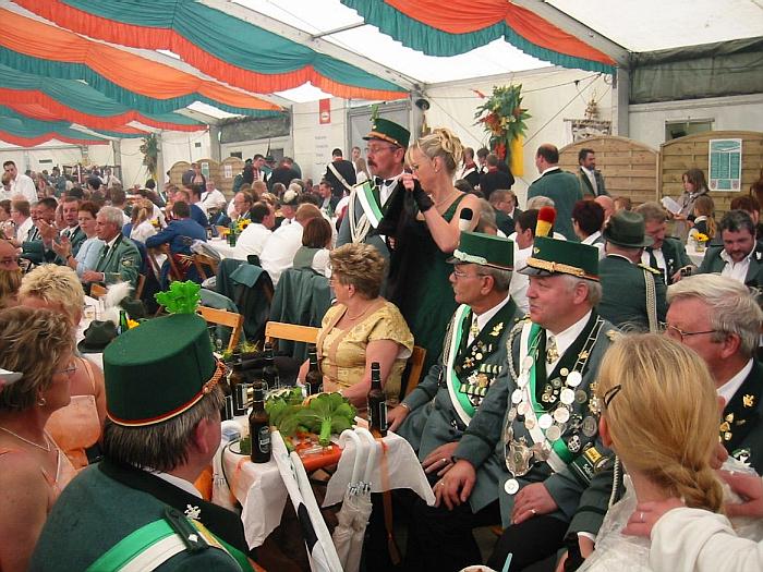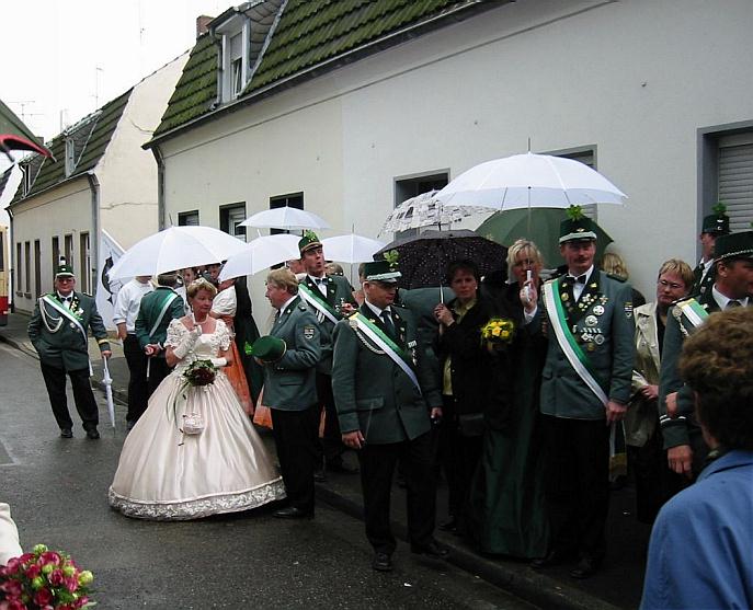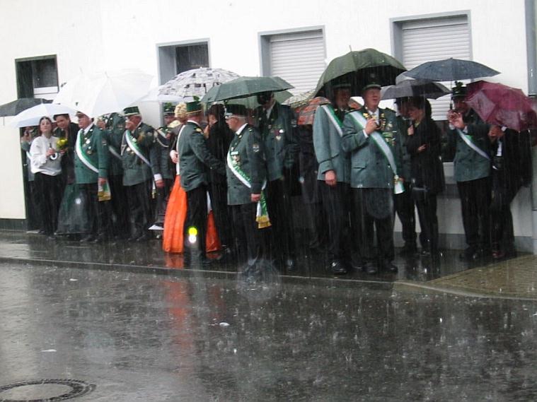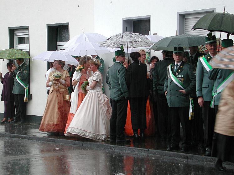 So zogen, wenige Minuten später, alle HövelhoferInnen, mehr oder weniger durch den Regen betroffen, auf dem Festplatz ein. Für den Hofstaat konnte glücklicherweise noch ein freies Plätzchen im Festzelt organisiert werden. Wir anderen mußten draußen hoffen. Nach ein paar Minuten erneuter Wetterwechsel - Die Jacken konnten trocknen.