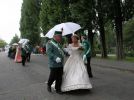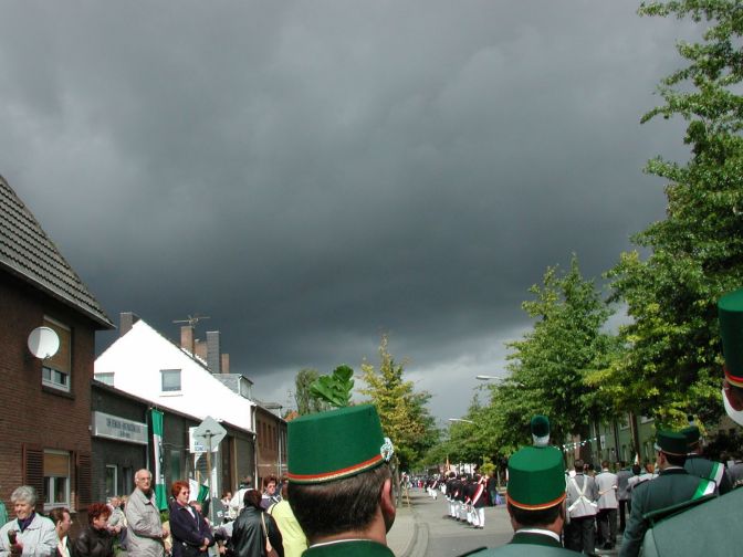 Trotz allem schönen Wetter drohte doch immer wieder eine dunkle Wolke. Diese hatte sich zum Ende des Hövelhofer Marsches jedoch schon sehr vergrößerst und auch die Färbung ließ nichts Gutes ahnen. Dann kam es wie es kommen mußte, 500 m vor dem Ziel mußten die Regenschirme geöffnet werden.