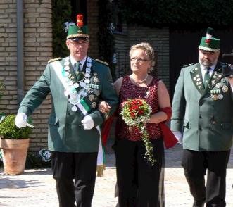 Als Königskompanie hat man das Privileg das Königpaar, die Prinzen- und Hofstaatpaare von der Königsresidenz zur Pfarrkirche (zum Antreten) geleiten zu dürfen. Deshalb trat die Dorfkompanie bereits um 16:00 Uhr den Marsch in die Königsresidenz an. Mit der Blaskapelle Hövelriege und dem Spielmannszug traf die Kompanie pünktlich bei Familie Michelis ein. Herrlichstes Wetter hatte sich eingestellt und der Hofstaat hatte sich zum Empfang der Kompanie bereits am Königsbogen formiert. Kompaniechef Dieter Reichelt klingelte an der Eingangstür um das Königspaar Johannes und Angelika im Präsentiermarsch zur Königskompanie zu geleiten und der Kompanie ihr Königspaar zu präsentieren. Nicht jedoch ohne zuvor Königin Angelika einen entsprechenden Blumenstrauß zu überreichen, den sie dann am Samstag mit sich führte. Nach Abschreitung der Front durch das Königspaar und noch einiger Momente der Verweilung vor Ort wurde dann der gesamte Hofstaat in die Allee geführt, wo bereits die anderen Kompanien anwesend waren um dann gemeinsam mit der Schützenmesse das diesjährige Schützenfest zu beginnen. Nach einer feierlichen und sehr gut besuchten Schützenmesse, zelebriert durch Präses Bernd Haase, marschierte das Bataillon ohne Tritt zum Ehrenmal um den Verstorbenen zu gedenken und einen Kranz nieder zu legen. Von unserer Kompanie wurden ausgezeichnet für: 25 Jahr Mitgliedschaft