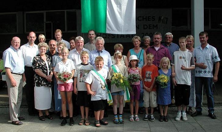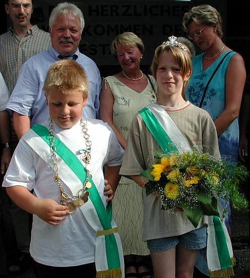 Nicht zu vergessen das Vogelschießen für die Kinder. Wie in all den Jahren zuvor, herrschte wieder großer Andrang am Schießstand. Nach vielen Schüssen stellte sich der neue Kinderhofstaat dem Fotografen. Die zuvor stattgefundene Proklamation des Kinderhofstaat nahm das amtierende Königspaar Robert und Agnes Förster mit dem Hofstaat und Präses Christoph Robrecht vor.