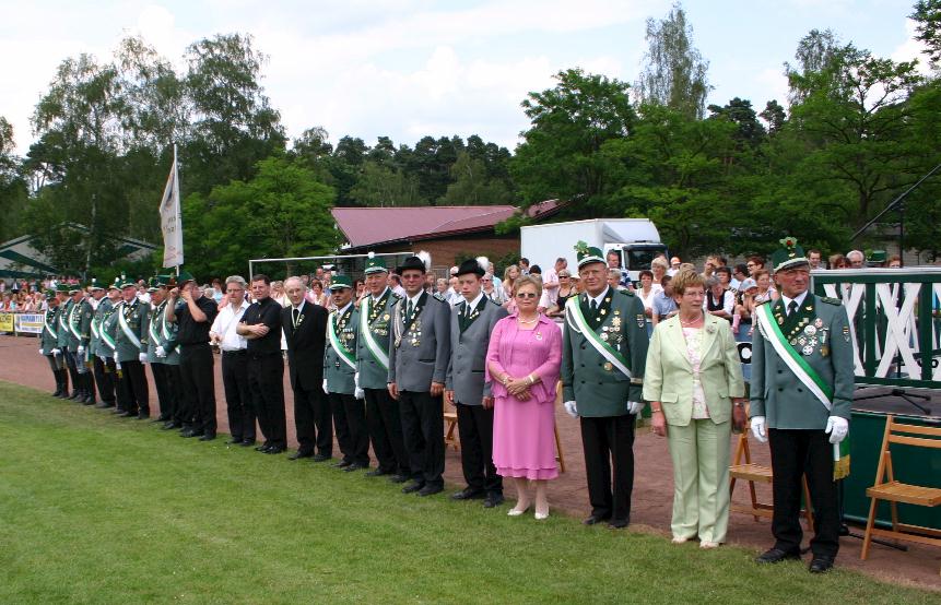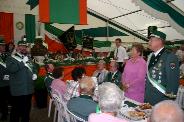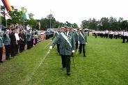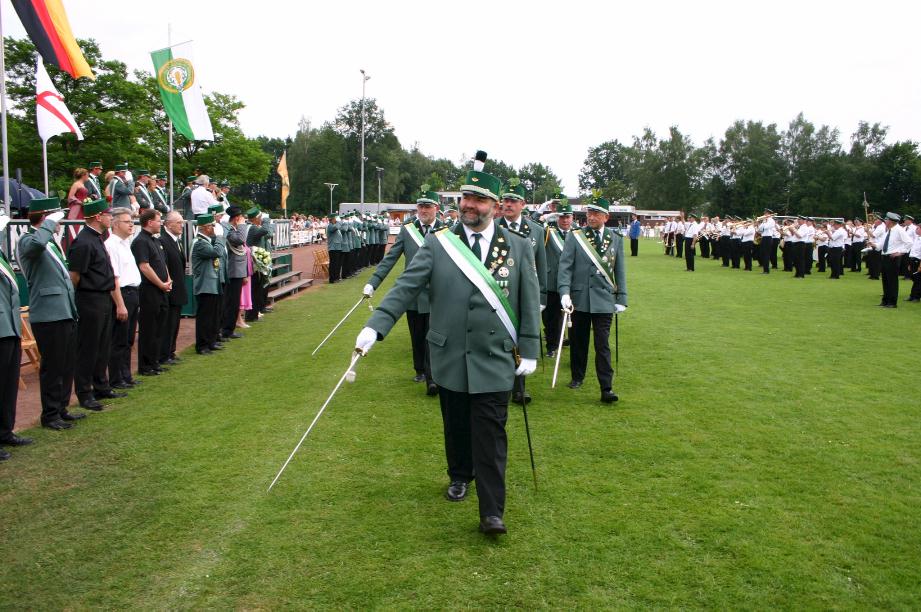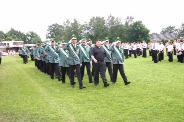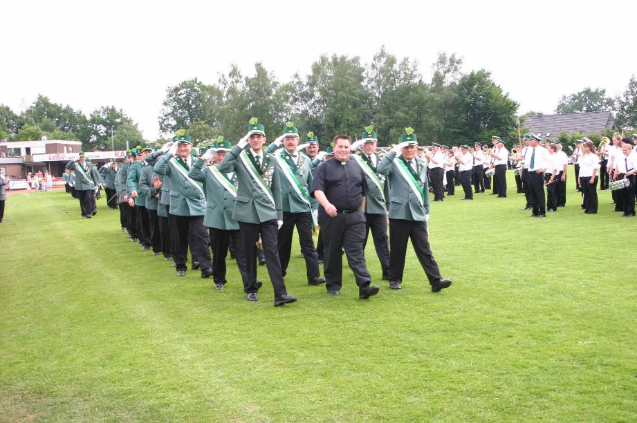 Vorbeimarsch der Dorfkompanie am Thron und an den zahlreichen Ehrengästen. Ein besonderes Erlebnis war es sicherlich für Vikar Daniel Meiworm, der erstmalig am Schützenfest in Hövelhof teilnahm und sich in seinem Zug sichtlich sehr wohl fühlte.
