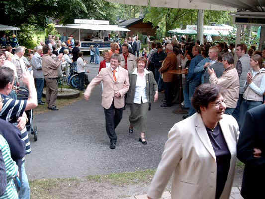 Das Familienfest der Klausheider Kompanie am 11.07.2004 begann mit dem Einzug des Königspaares Bruno und Ingrid Schmidt und dem ganzen Hofstaat. |