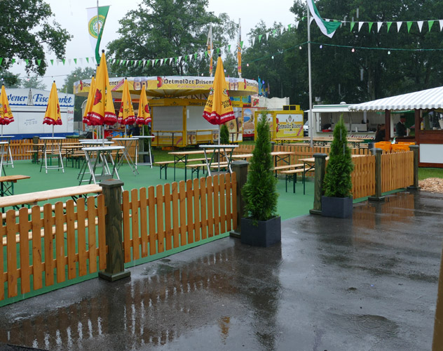 Wetterbedingt Nach der Hl. Messe und der Kranzniederlegung in der Kirche ging es mit einigen Bussen gleich zum Festzelt. |