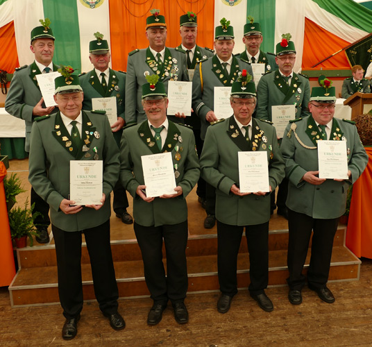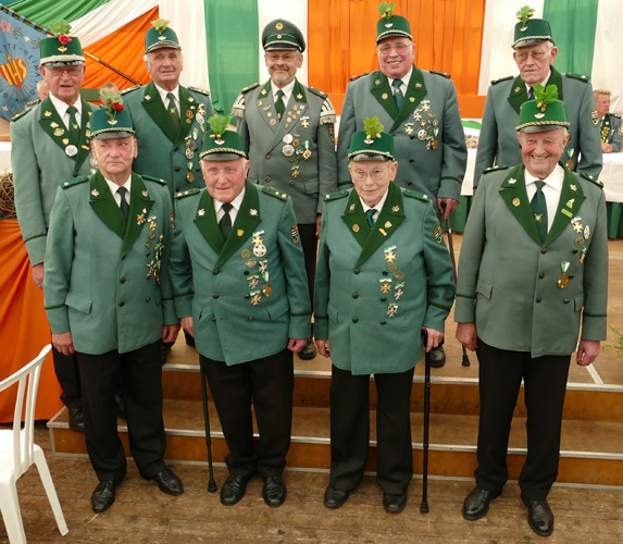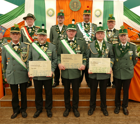 Das Schulterband zum St.Sebastianus Ehrenkreuz wurde an folgende Schützen verliehen. Udo Gerke unten 2 v.l. und Oberst Hubert Bonke (Klausheider) unten 3 v.l. Das St.Sebastianus Ehrenkreuz wurde an Theo Meier unten 4 v.l. verliehen. |