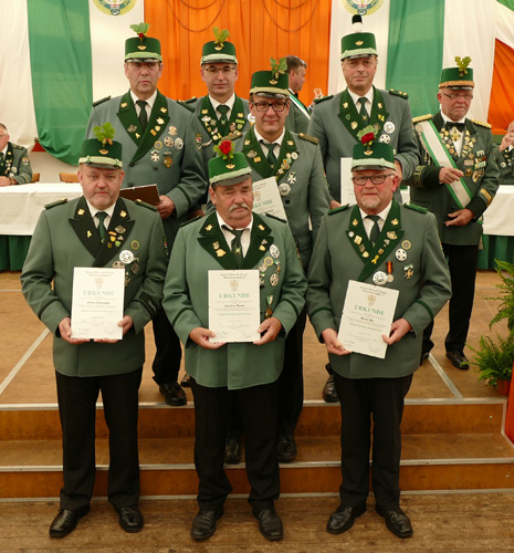 Folgende Klausheider Schützen wurden für 60 Jahre im Verein ausgezeichnet: Stefan Niermeier oben 2 von rechts, Hans Fortmeier oben rechts Josef Meier unten 2 von rechts, Hermann Johanntokrax, unten rechts Heinz Göke nicht auf dem Bild |